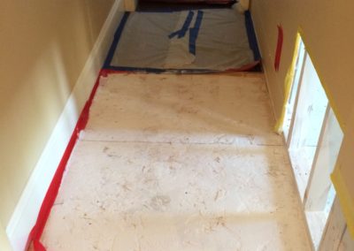 Before – Water damage to hallway flooring and walls from washing machine flood